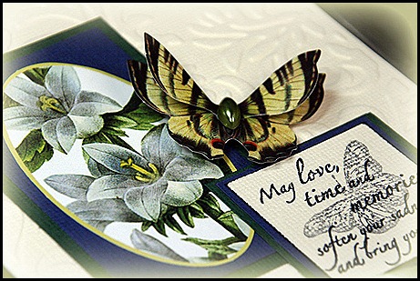 Quick and simple with the supplies provided, the die cuts are just beautiful and come already as partial images so you can pop them up for an awesome 3-D effect! No fussy cutting! YEAH!