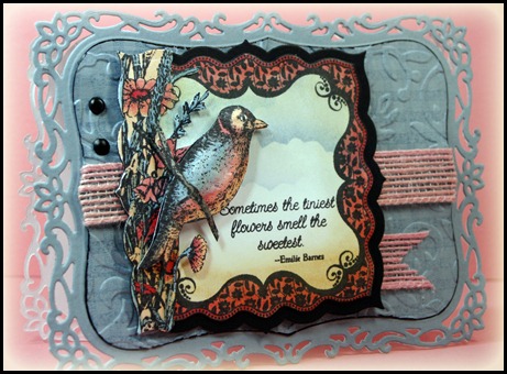 I stamped Romantic Floral Designs, die cut with the matching Spellbinders Labels 26 and trimmed close to the image edge then cut a black mat using the same die. It’s colored with Copics and sponged cloud template with Faded Jeans and edges with Dried Marigold. The quote is from the Morning Glory set.
